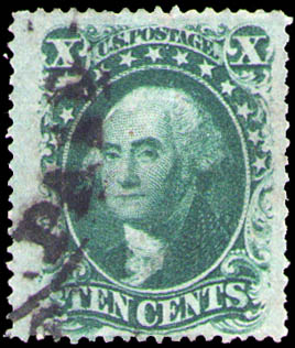 1859, 10¢ Washington, green, type V (Scott 35), beautifully well centered, with a neat "Paid" cancel, Very Fine. Scott $55.