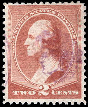 Lot 501 o 1883, 2¢ Washington, red brown (Scott 210), complete strike of Liberty Head fancy cancel in purple; minute thin at upper right, a Very Fine strike on a Fine to Very Fine appearing stamp. Estimate $200 - 300. |