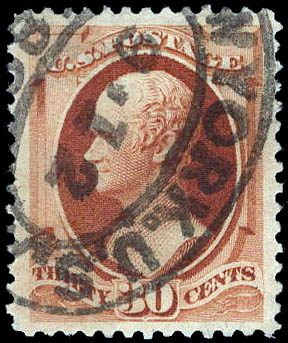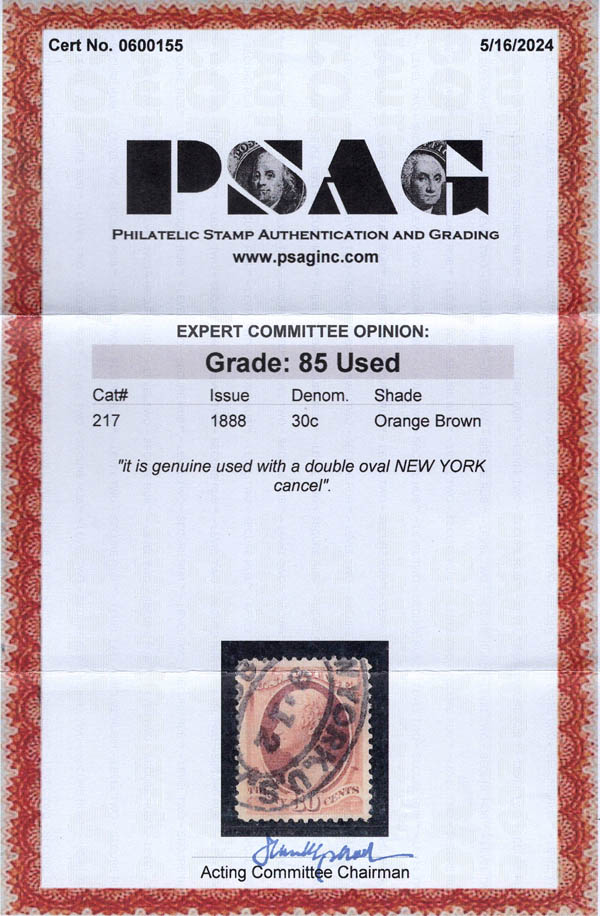 Lot 509 o 1888, 30¢ Hamilton, orange brown (Scott 217), double oval New York cancel, Very Fine to Extremely Fine, with 2024 P.S.A.G. certificate graded VF-XF 85. Scott $90. SMQ $125. Scott Stamp Values $120. Estimate $80 - 120. |