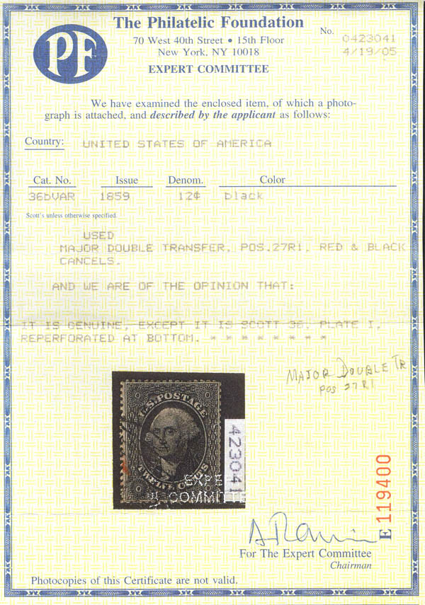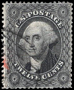 1857, 12¢ Washington, black, plate I (Scott 36), black and red cancels; reperfed at bottom, otherwise nearly Fine, with photocopy of 2005 P.F. certificate. Scott $345.