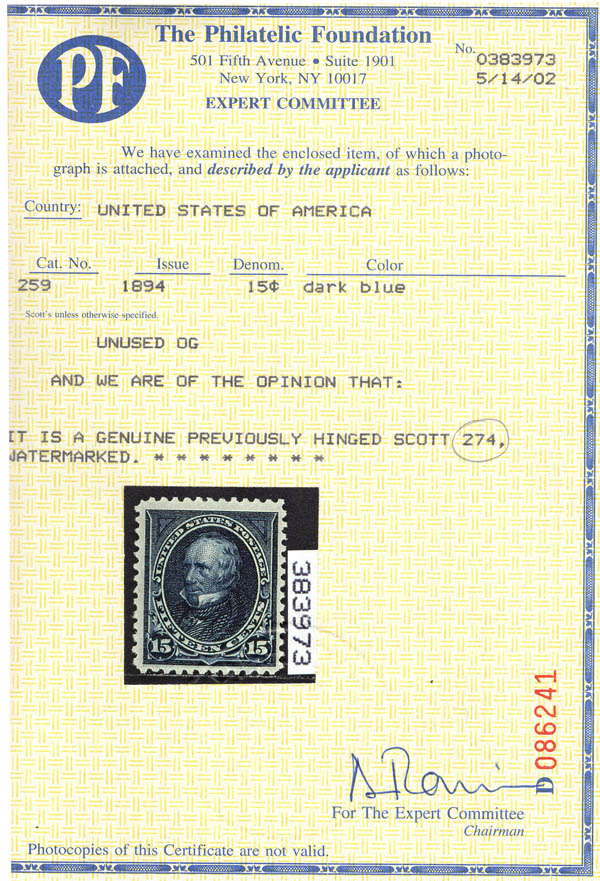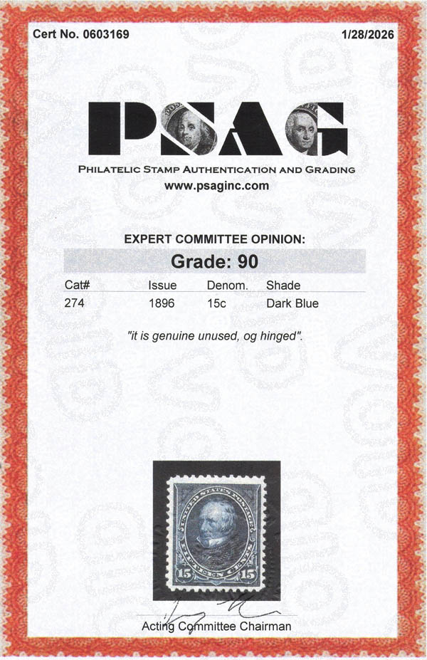 Lot 51![]() 1895, 15¢ Clay, dark blue, D.L. watermark (Scott 274), o.g., lightly hinged, Extremely Fine, with 2002 P.F. and 2026 P.S.A.G. certificates, the latter graded XF 90. Scott $200. SMQ $400. Scott Stamp Values $360. Estimate $250 - 350. |