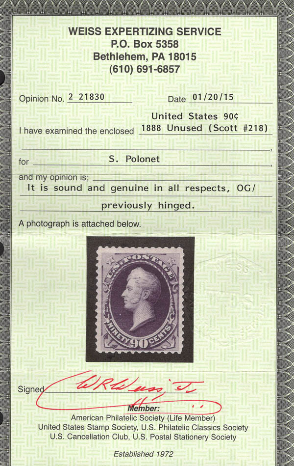 1888, 90¢ Perry, purple (Scott 218), o.g., hinged, Fine, with 2015 Weiss certificate. Scott $850.