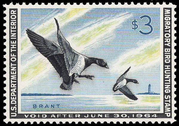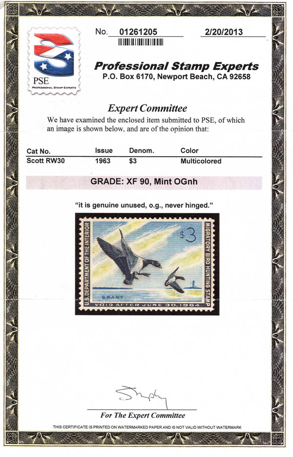 Federal Duck Stamp, 1963, $3 Brants (Scott RW30), o.g., never hinged, Extremely Fine, with 2013 P.S.E. certificate graded XF 90. Scott $100. SMQ $160.