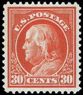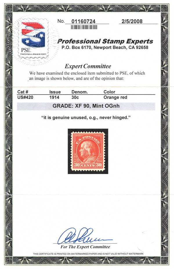 Lot 52![]() ![]() 1914, 30¢ Franklin, orange red, S.L. watermark, perf. 12 (Scott 420), a beautifully well centered gem, o.g., never hinged, Extremely Fine, with 2008 P.S.E. certificate graded XF 90. Scott $250. SMQ $450. Estimate $300 - 400. |