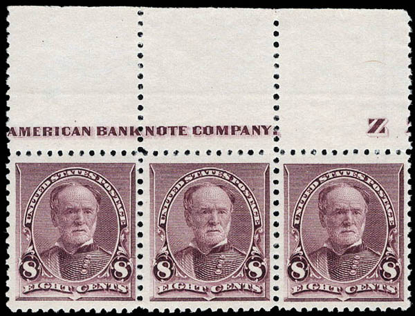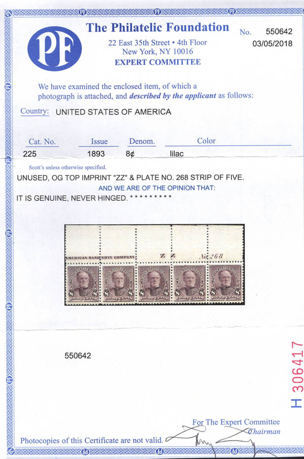 Lot 522![]() ![]() 1893, 8¢ Sherman, lilac (Scott 225), strip of 3 with part imprint, o.g., never hinged, Very Fine, with 2018 P.F. certificate for strip of 5, this being the three left stamps. Scott $450. Estimate $200 - 300. |
