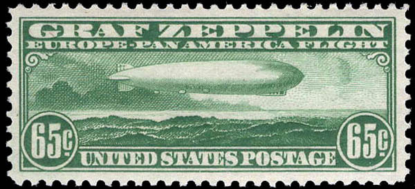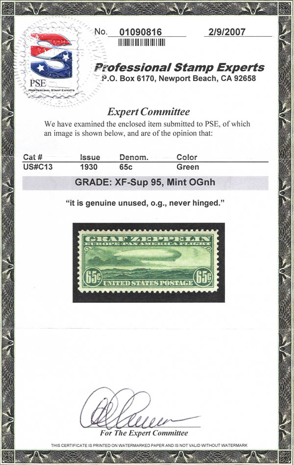 Airmail, 1930, 65¢ Graf Zeppelin (Scott C13), o.g., never hinged, Extremely Fine to Superb, with 2007 P.S.E. certificate graded XF-SUP 95. Scott $250. SMQ $600.