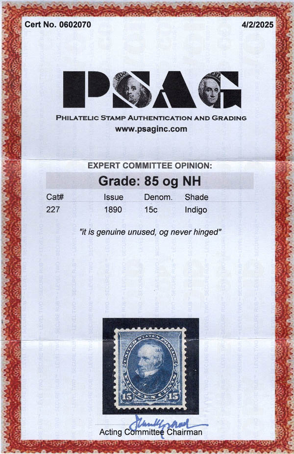 Lot 525![]() ![]() 1890, 15¢ Clay, indigo (Scott 227), wonderfully well centered with luxuriant color, o.g., never hinged, Very Fine to Extremely Fine, with 2025 P.S.A.G. certificate graded VF-XF 85. Scott $625. SMQ $975. Scott Stamp Values $950. Estimate $750 - 1,000. |