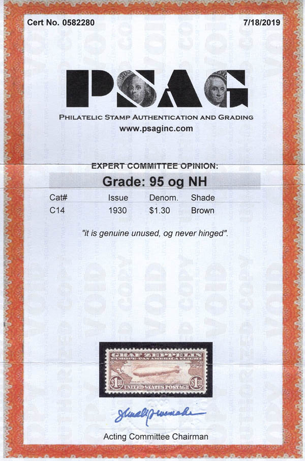 Airmail, 1930, $1.30 Graf Zeppelin (Scott C14), o.g., never hinged, Extremely Fine to Superb, with 2019 P.S.A.G. certificate graded XF-SUP 95. Scott $575. SMQ $1,250. Scott Stamp Values $1,125.