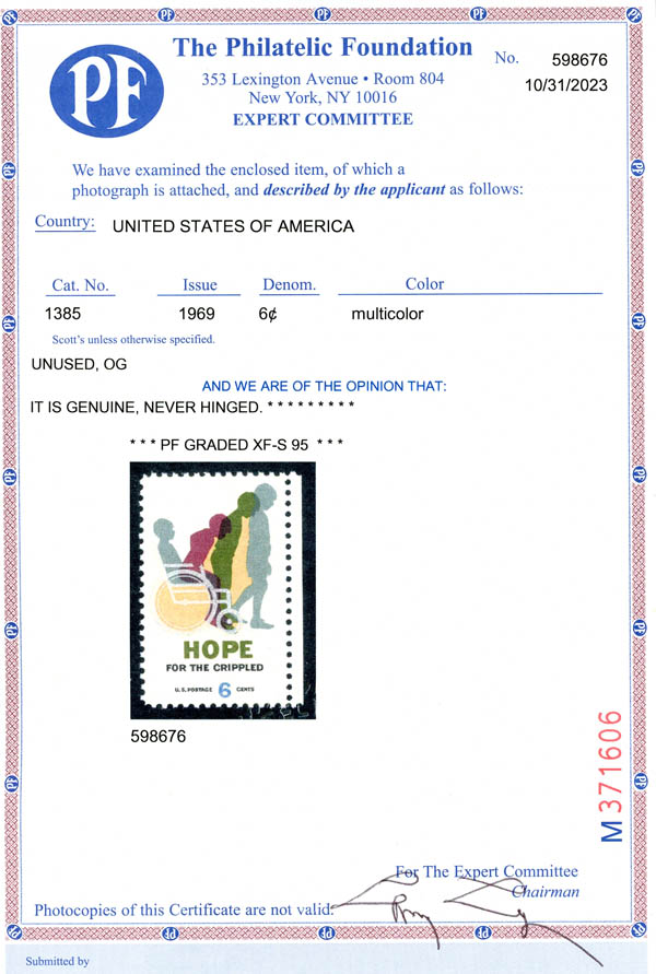 1969, 6¢ Hope for the Crippled (Scott 1385), o.g., never hinged, Extremely Fine To Superb, with 2023 P.F. certificate graded XF-SUP 95.