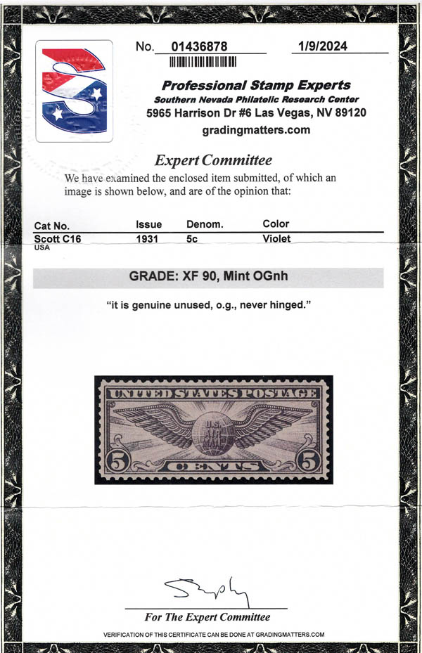 Airmail, 1931, 5¢ Winged Globe, rotary press printing (Scott C16), o.g., never hinged, Extremely Fine, with 2024 P.S.E. certificate graded XF 90. SMQ $75.