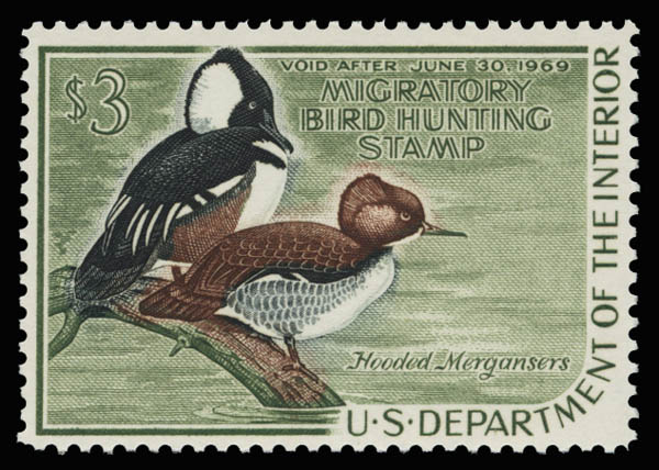 Hunting Permit, 1968, $3 Hooded Mergansers (Scott RW35), o.g., never hinged, Very Fine.