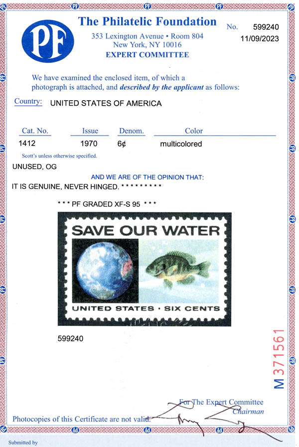 1970, 6¢ Save Our Water (Scott 1412), o.g., never hinged, Extremely Fine To Superb, with 2023 P.F. certificate graded XF-SUP 95.