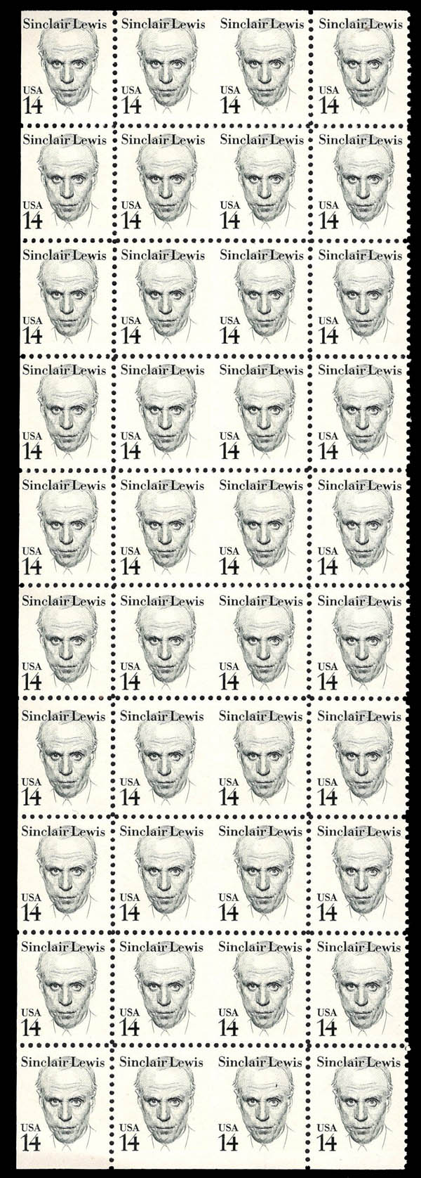 1985, 14¢ Sinclair Lewis, horizontal pair, imperf. between (Scott 1856c), block of 40, containing 10 imperf. between pairs, o.g., never hinged, Extremely Fine. Scott $86.