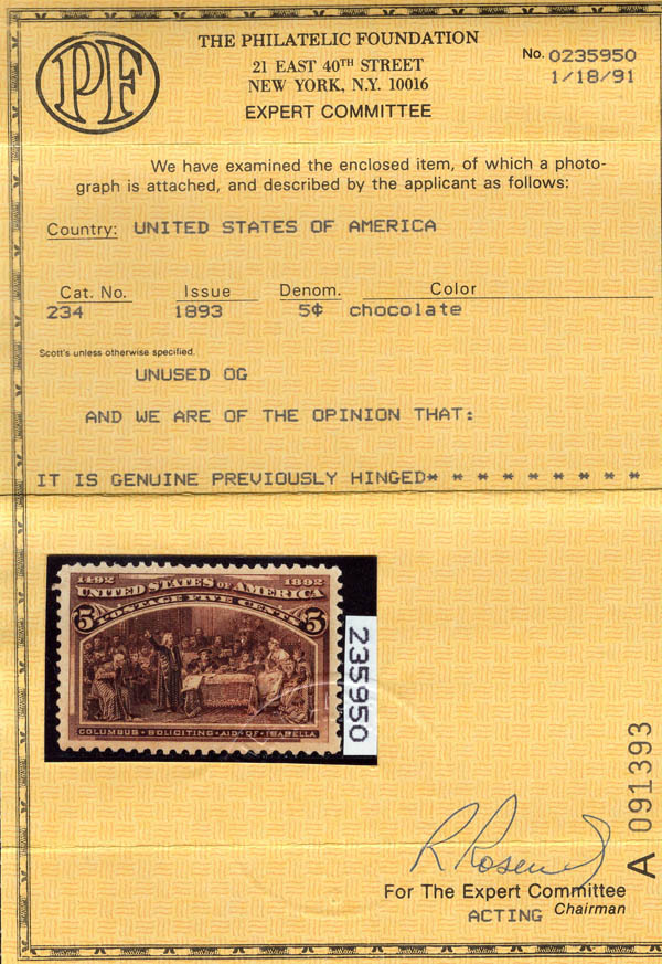 1893, 5¢ Columbian (Scott 234), o.g., very lightly hinged, Very Fine to Extremely Fine, with 1991 P.F. certificate. Scott $55.