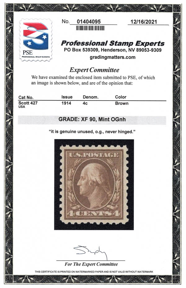 1914, 4¢ Washington, brown, S.L. watermark, perf. 10 (Scott 427), o.g., never hinged, Extremely Fine, with 2021 P.S.E. certificate graded XF 90. Scott $75. SMQ $225.