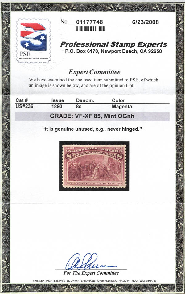 1893, 8¢ Columbian (Scott 236), o.g., never hinged, Very Fine to Extremely Fine, with 2008 P.S.E. certificate graded VF-XF 85. Scott $140. SMQ $250.