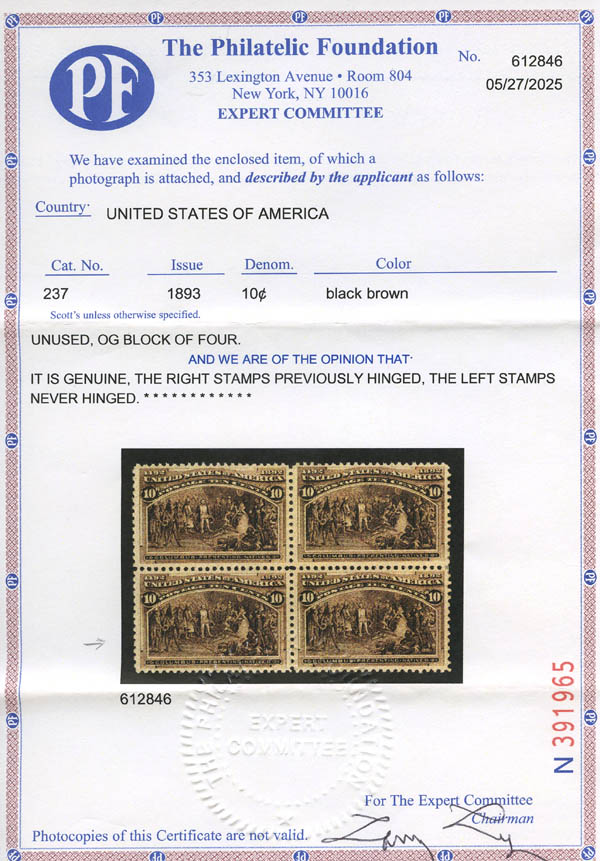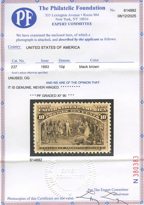 Lot 542![]() ![]() 1893, 10¢ Columbian (Scott 237), exceptionally choice centering, o.g., never hinged, Extremely Fine, with 2025 P.F. (original block) and 2025 P.F. certificates, the latter graded XF 90. Scott $265. SMQ $575. Scott Stamp Values $550. Estimate $350 - 500. |