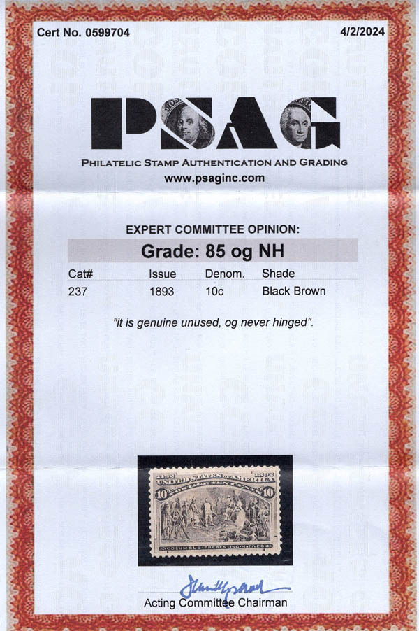 1893, 10¢ Columbian (Scott 237), o.g., never hinged, Very Fine to Extremely Fine, with 2024 P.S.A.G. certificate graded VF-XF 85. Scott $265. SMQ $425. Scott Stamp Values $375.