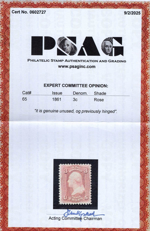 1861, 3¢ Washington, rose (Scott 65), unusually rich color, very bright and nicely centered, o.g., hinged, Fine to Very Fine, with 2025 P.S.A.G. certificate. Scott $125.