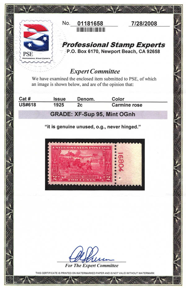 1925, 2¢ Lexington-Concord (Scott 618), a gorgeous plate number single, o.g., never hinged, Extremely Fine to Superb, with 2008 P.S.E. certificate graded XF-SUP 95. SMQ $55.