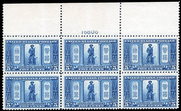1925, 5¢ Lexington-Concord (Scott 619), top plate block of 6, o.g., never hinged, Fine to Very Fine. Scott $275.
