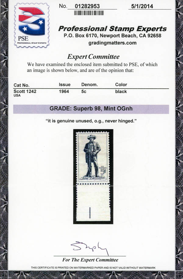 1964, 5¢ Sam Houston (Scott 1242), o.g., never hinged, Superb, with 2014 P.S.E. certificate graded SUP 98. SMQ $80.