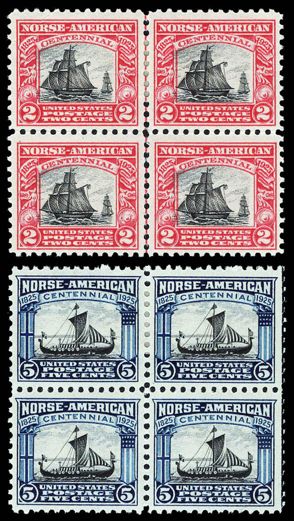 1925, Norse-American complete (Scott 620-621), blocks of 4, 2¢ has part of the centerline as well, 2 stamps hinged and 2 stamps n.h. in each block, Fine to Very Fine. Scott $74.