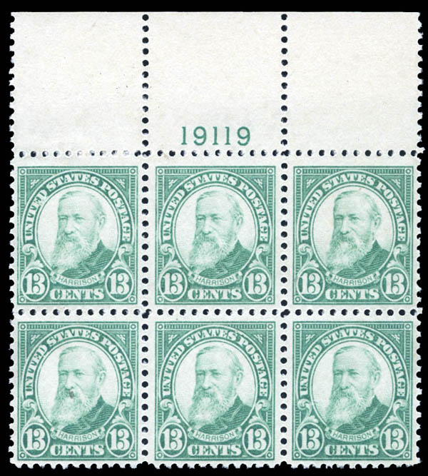 1926, 13¢ Harrison (Scott 622), top plate block of 6, flawless o.g., never hinged, Fine to Very Fine. Scott $300.