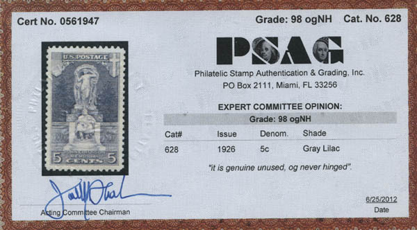 1926, 5¢ Ericsson (Scott 628), perfect in every respect, flawless o.g., never hinged, Superb, with 2012 P.S.A.G. certificate graded SUP 98. SMQ $190.