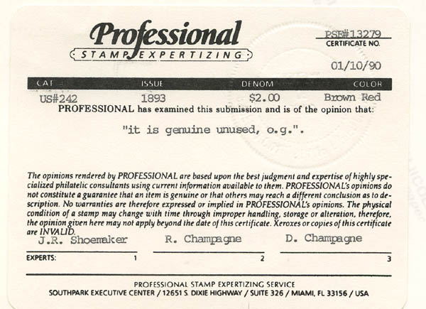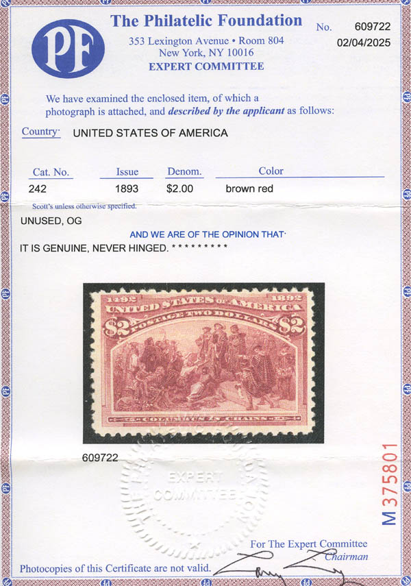 1893, $2 Columbian (Scott 242), o.g., never hinged, Fine to Very Fine, with 1990 P.S.E. and 2025 P.F. certificates. Scott $3,600.