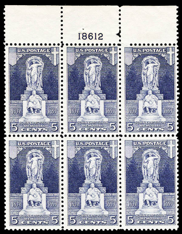 1926, 5¢ Ericsson (Scott 628), plate block of 6, o.g., never hinged, Fine to Very Fine. Scott $83.