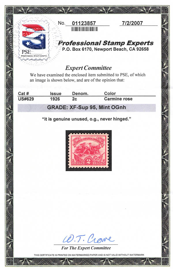 1926, 2¢ White Plains (Scott 629), a flawless gem, o.g., never hinged, Extremely Fine to Superb, with 2007 P.S.E. certificate graded XF-SUP 95. SMQ $55.