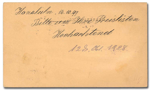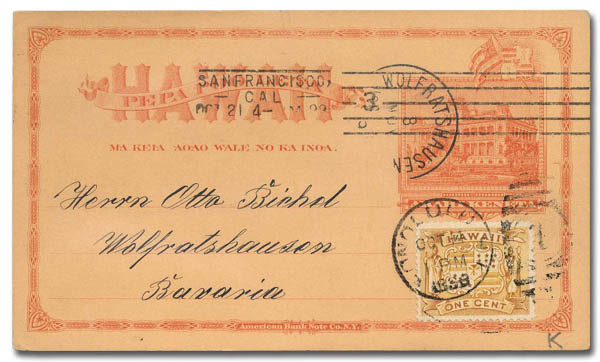 Hawaii, 1899, card from Honolulu to Bavaria, Germany, an 1893 1¢ stationery card uprated with 1¢ yellow, with San Francisco and Bremen transit cancels, Very Fine. Scott 74, UX8.