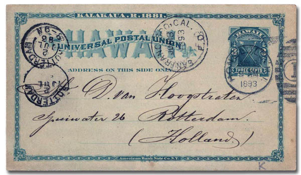Hawaii, 1893, card from Honolulu to Rotterdam, Netherlands, with San Francisco transit and Netherlands arrival postmarks, Fine to Very Fine. Scott UX3; $175. Higgins and Gage 3.
