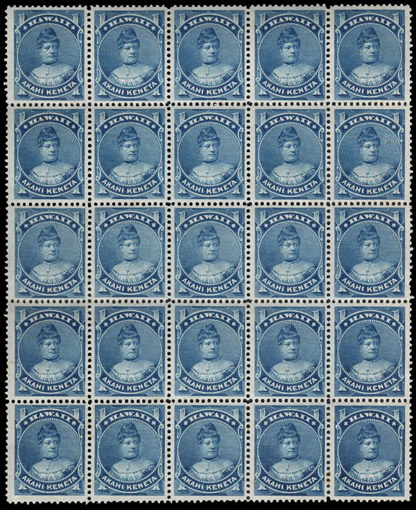 Hawaii, 1882, Princess Likelike, 1¢ blue (Scott 37), block of 25, a gorgeous multiple, o.g., never hinged, Fine to Very Fine. Scott $688.
