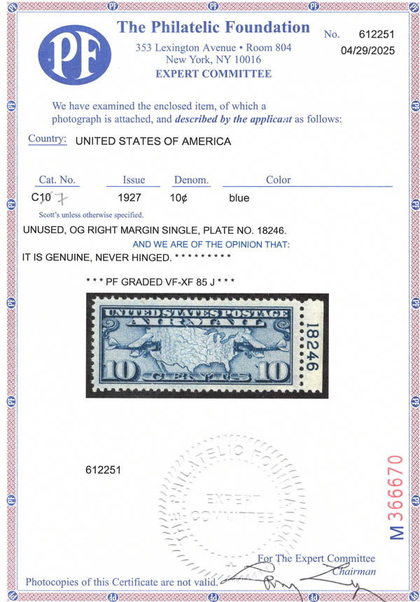 Airmail, 1926, 10¢ Map & Planes (Scott C7), plate number single, o.g., never hinged, Very Fine to Extremely Fine, with 2025 P.F. certificate graded VF-XF 85 J. SMQ $25.