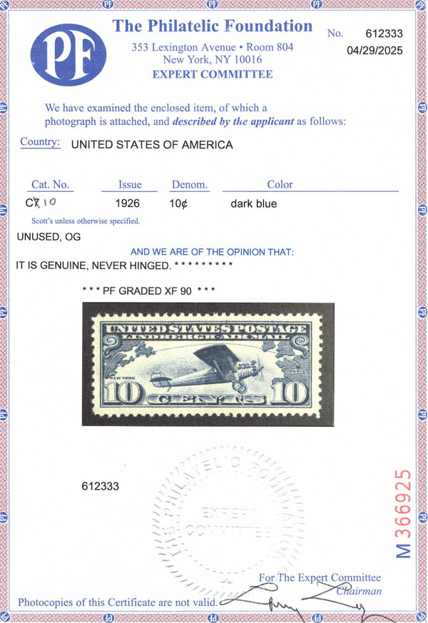 Airmail, 1927, 10¢ Lindbergh (Scott C10), o.g., never hinged, Extremely Fine, with 2025 P.F. certificate graded XF 90. SMQ $45.