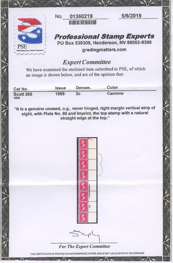 Lot 592![]() ![]() 1895, 2¢ Washington, type I, carmine, D.L. watermark (Scott 265), sheet margin vertical strip of 3, o.g., never hinged, Fine to Very Fine, with three color copies of a 2019 P.S.E. certificate for a strip of 8. Scott $315. Estimate $100 - 150. |