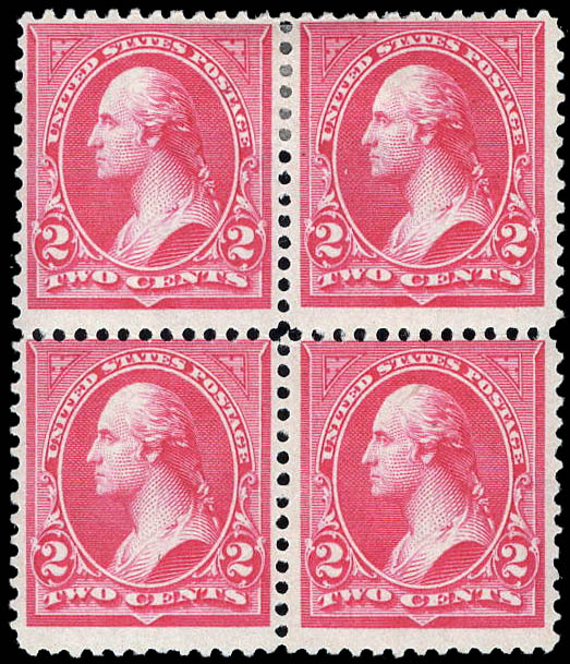 Lot 593![]() /![]() ![]() 1895, 2¢ Washington, types II & III, carmine, D.L. watermark (Scott 266-267), block of 4, type II at left, type III at right, o.g., hinged at top, never hinged at bottom, Fine. Scott $820. Estimate $150 - 200. |