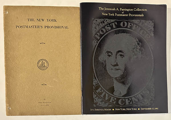 Lot 599![]() Paul MacGuffin, The New York Postmaster's Provisional, published in 1936, 36 pages with black and white illustrations plus The Jeremiah A. Farrington Collection of New York Potmaster Provisionals Auction catalog sold by Ivy, Shreve and Mader 1992. Estimate $30 - 40. |