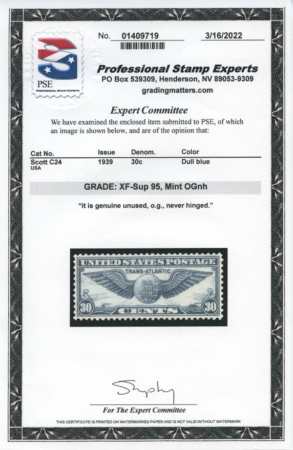 Lot 600![]() ![]() Airmail, 1939, 30¢ Transatlantic (Scott C24), an exceptionally well centered beauty, o.g., never hinged, Extremely Fine to Superb, with 2022 P.S.E. certificate graded XF-SUP 95. SMQ $75. Estimate $50 - 75. |