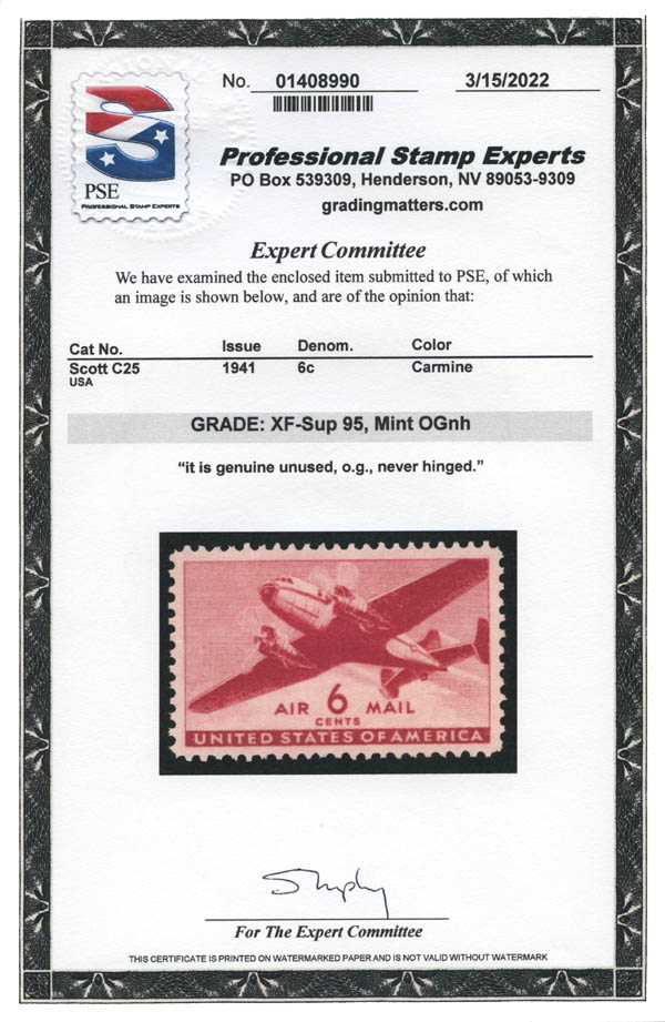 Airmail, 1941, 6¢ Transport (Scott C25), outstandingly well centered, o.g., never hinged, Extremely Fine to Superb, with 2022 P.S.E. certificate graded XF-SUP 95. SMQ $45.