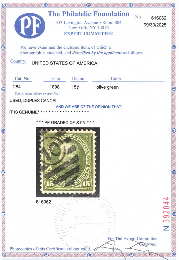 Lot 609 o 1898, 15¢ Clay, olive green (Scott 284), fresh color and razor sharp impression, duplex cancel, Extremely Fine to Superb, with 2025 P.F. certificate graded XF-SUP 95. Scott $13. SMQ $450. Scott Stamp Values $450. Estimate $300 - 400. |