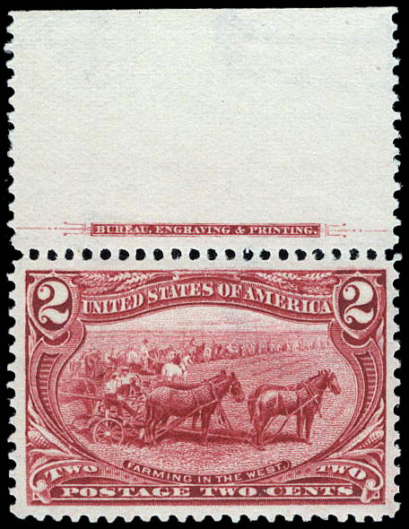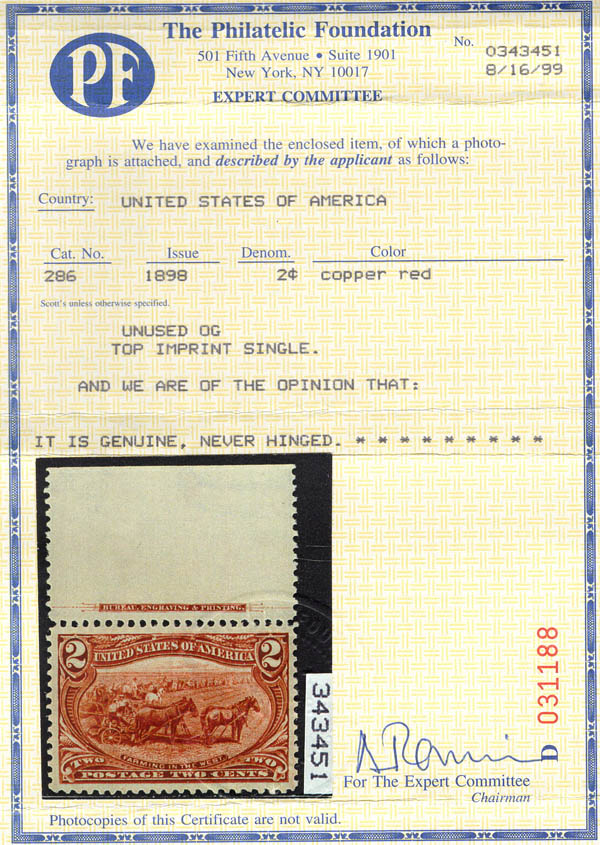 Lot 611![]() ![]() 1898, 2¢ Trans-Miss. (Scott 286), imprint single, o.g., never hinged, Very Fine to Extremely Fine, with 1999 and 2008 P.F. certificates, the latter graded VF-XF 85. Scott $73. SMQ $115. Scott Stamp Values $110. Estimate $75 - 100. |
