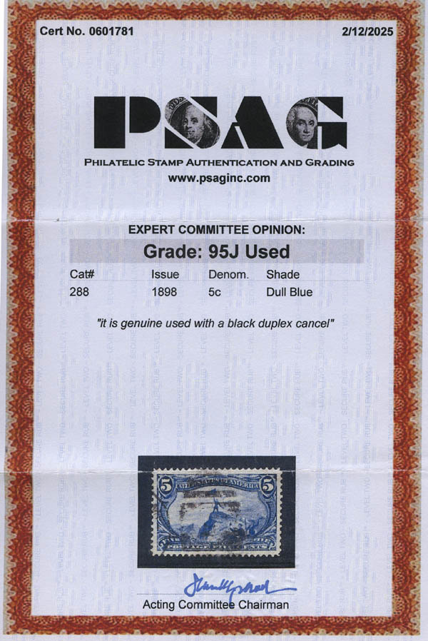 Lot 619 o 1898, 5¢ Trans-Miss. (Scott 288), an outstandingly choice gem with magnificent centering and jumbo margins, Extremely Fine to Superb, with 2025 P.S.A.G. certificate graded XF-SUP 95J. Scott $25. SMQ $550. Estimate $350 - 500. |
