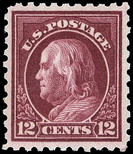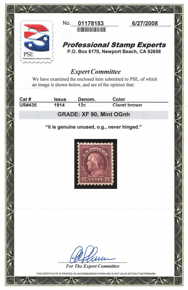 1914, 12¢ Franklin, claret brown, S.L. watermark, perf. 10 (Scott 435), o.g., never hinged, Extremely Fine, with 2008 P.S.E. certificate graded XF 90. SMQ $160.