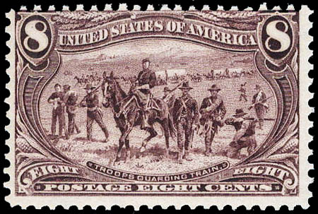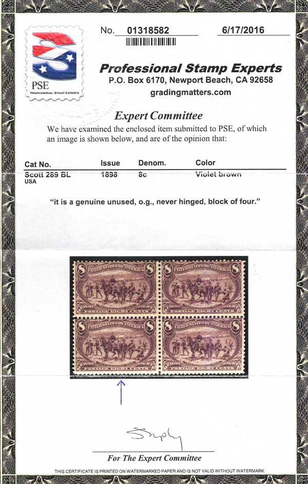 1898, 8¢ Trans-Miss. (Scott 289), o.g., never hinged, about Fine, with 2016 P.S.E. certificate for block, this being the bottom left stamp. Scott $400.