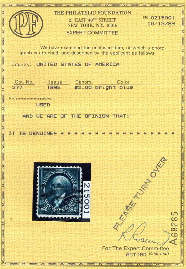 1895, $2 Madison, bright blue, D.L. watermark (Scott 277), deep color, machine cancel, Fine to Very Fine, with 2023 and 1989 P.F. certificates. Scott $400.