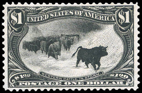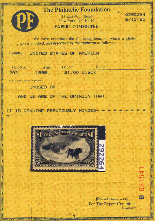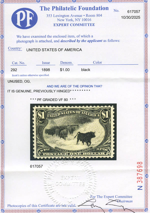 1898, $1 Trans-Miss. (Scott 292), o.g., lightly hinged, Very Fine, with 1995 and 2025 P.F. certificates, the latter graded VF 80. Scott $1,200.