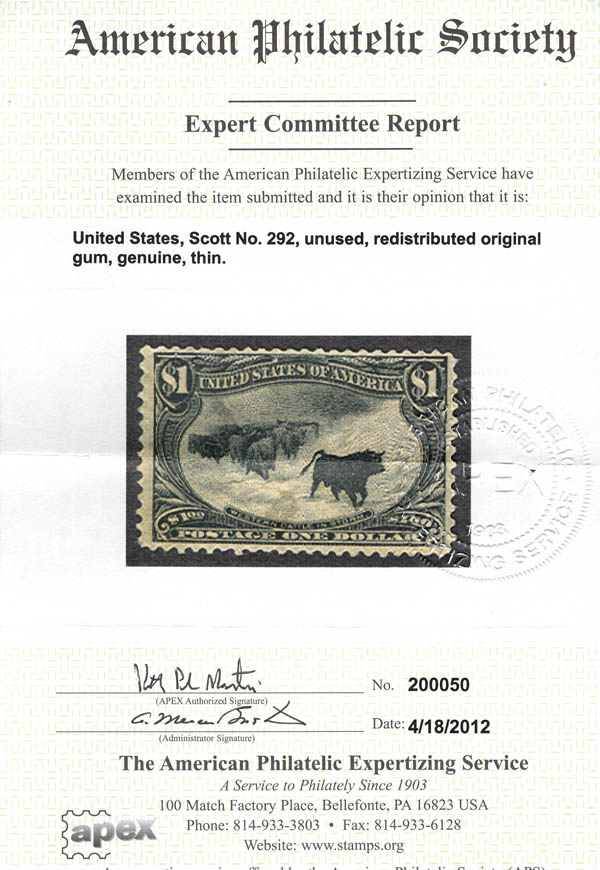 1898, $1 Trans-Miss. (Scott 292), redistributed o.g.; thin, Fine to Very Fine appearance, with 2012 A.P.S. certificate. Scott $1,200.